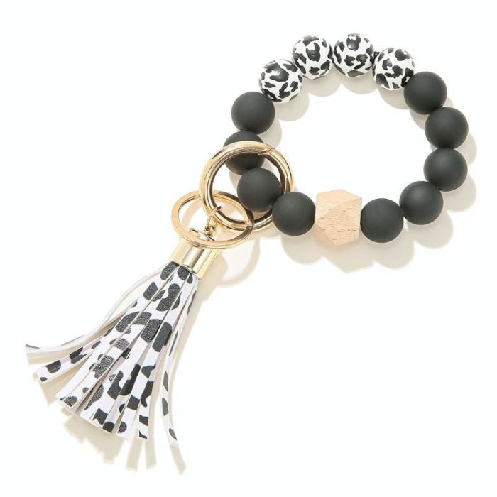 2 PCS Wooden Bead Frosted Bracelet Key Chain Pendant( Black and White Leopard Pattern)