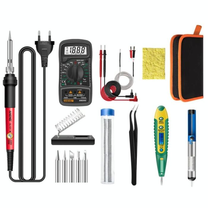 11. Product list: electric soldering iron / AN8205C multimeter / high-end soldering iron stand / soldering iron tip x5 storage bag / tin wire / tweezers / VD700 test pencil / cleaning sponge / tin suction device