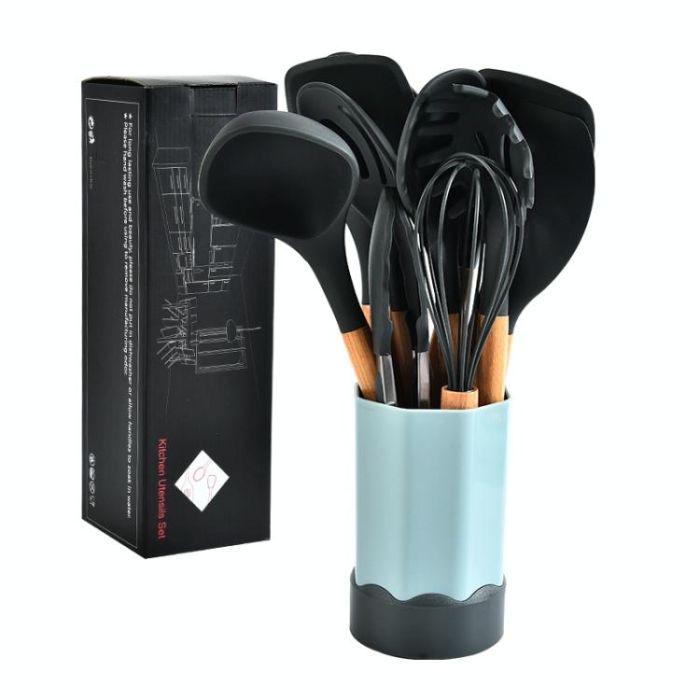 Beech Wood Silicone Kitchen Set With Storage Bucket(Dark Gray)