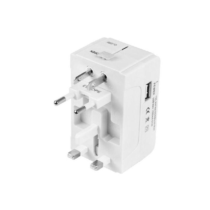 1. This universal adaptor is a compact one piece unit with 3 international adaptors, This item with fit the plugs in Europe / UK / USA / China / Japan / Spain and almost every country in the world