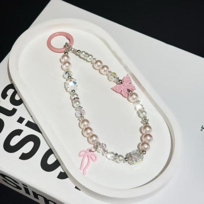 Diamond-Encrusted Pearl Butterfly Phone Chain(Pink)