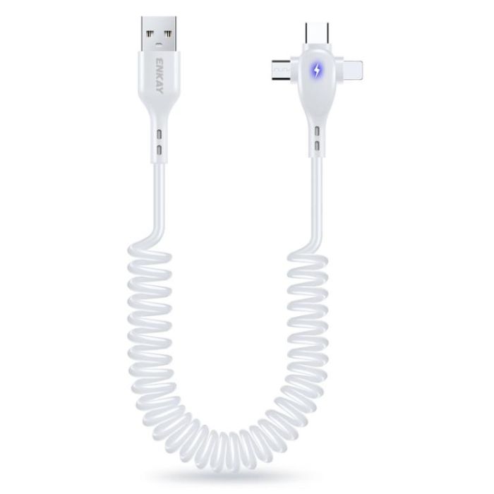 Description / ENKAY Hat-Prince 3 in 1 6A USB to 8 Pin+Type-C+Micro USB Supper Fast Charge Spring Cable, Length: 1.8m(White)