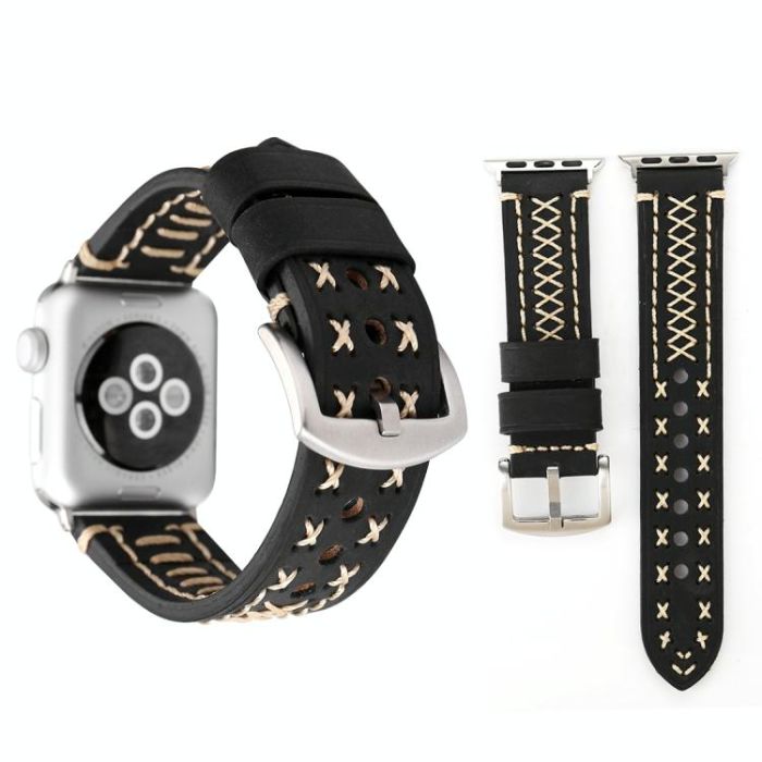 For Apple Watch Series 10 42mm / 9&8&7 41mm / SE 3&SE 2&6&SE&5&4 40mm / 3&2&1 38mm Manual Line Pattern Genuine Leather Wrist Watch Band(Black)