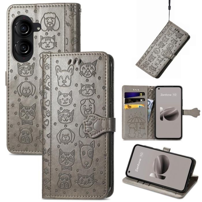 For ASUS Zenfone 10 Cat and Dog Embossed Leather Phone Case(Grey)