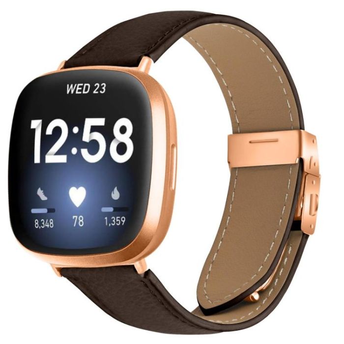 For Fitbit Versa 3 / 4 Lychee Texture Rose Gold Turtle Back Buckle Leather Watch Band(Coffee Color)