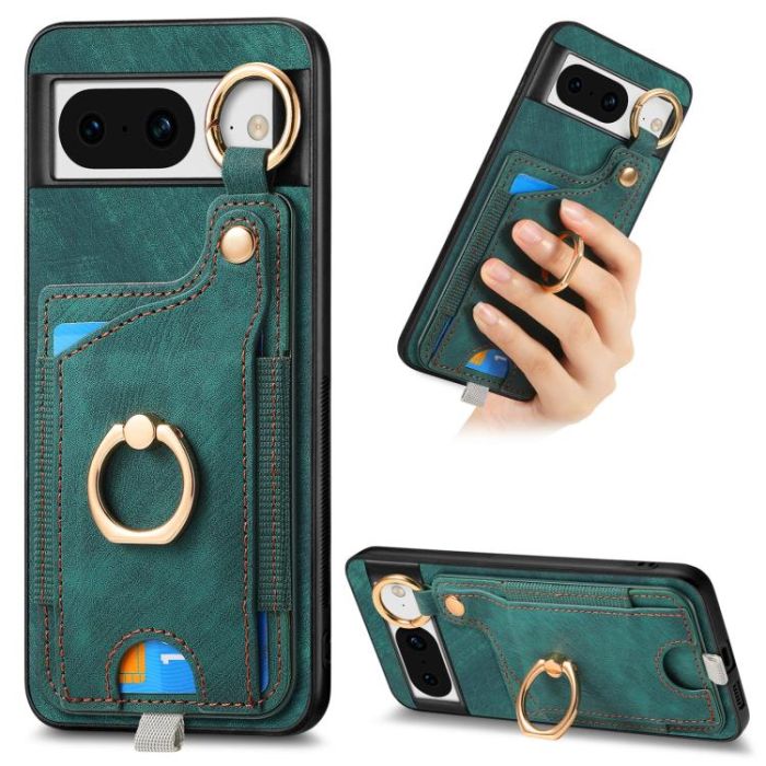 For Google Pixel 8 Retro Skin-feel Ring Card Bag Phone Case with Hang Loop(Green)