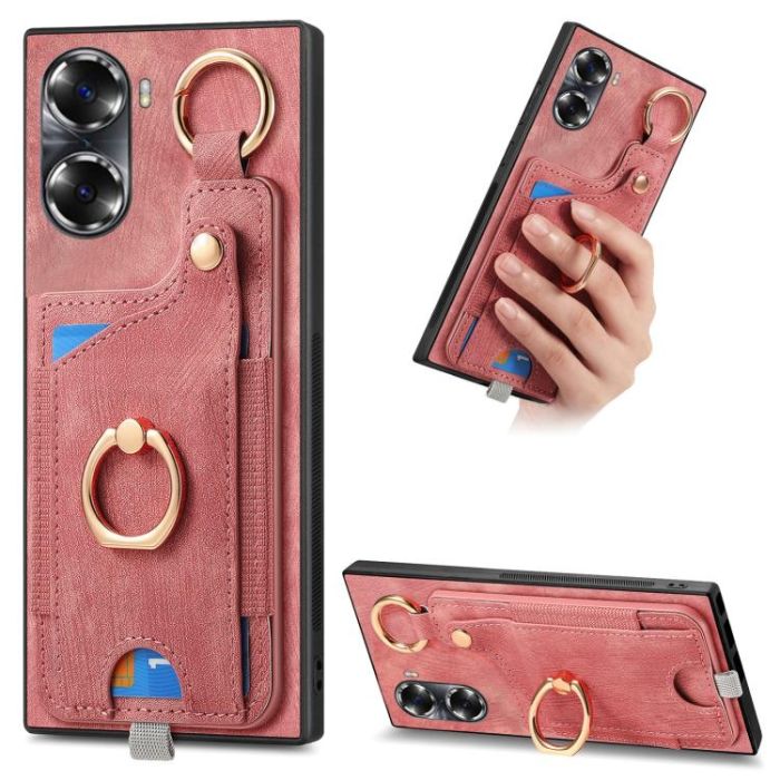 For Honor 60 Retro Skin-feel Ring Card Bag Phone Case with Hang Loop(Pink)