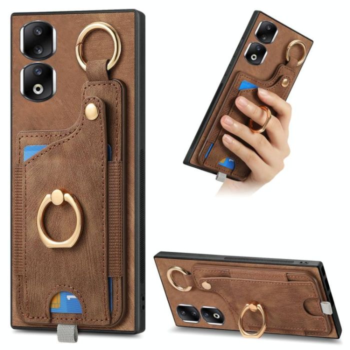 For Honor 90 Pro Retro Skin-feel Ring Card Bag Phone Case with Hang Loop(Brown)