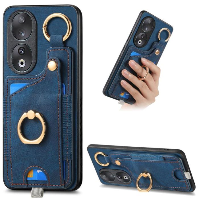 For Honor 90 Retro Skin-feel Ring Card Bag Phone Case with Hang Loop(Blue)