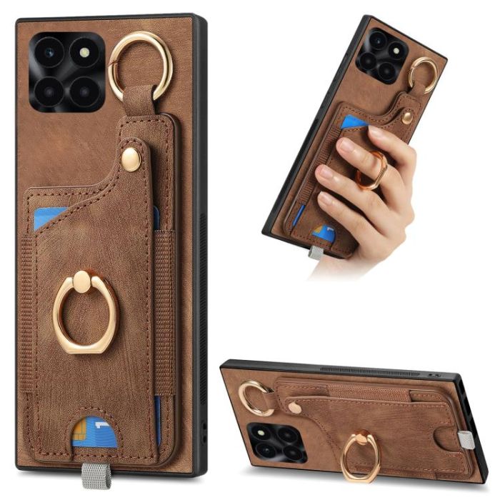 For Honor X6a Retro Skin-feel Ring Card Bag Phone Case with Hang Loop(Brown)