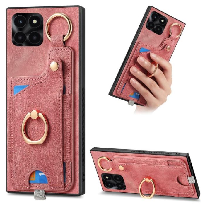 For Honor X6a Retro Skin-feel Ring Card Bag Phone Case with Hang Loop(Pink)