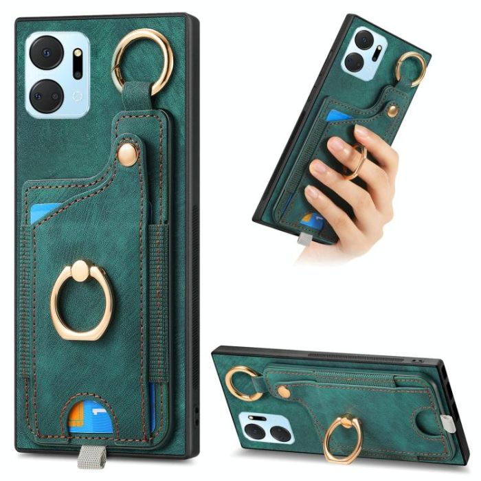 For Honor X7a Retro Skin-feel Ring Card Bag Phone Case with Hang Loop(Green)