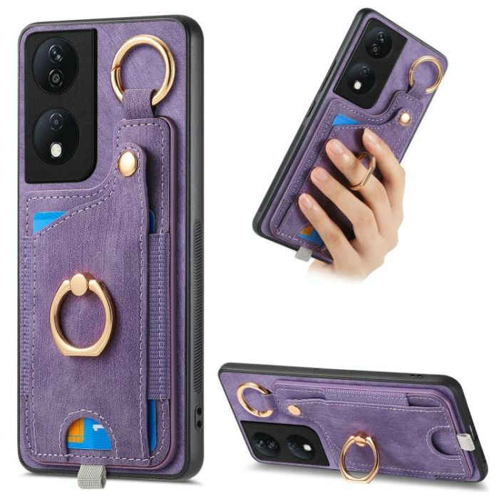 For Honor X7b Retro Skin-feel Ring Card Bag Phone Case with Hang Loop(Purple)