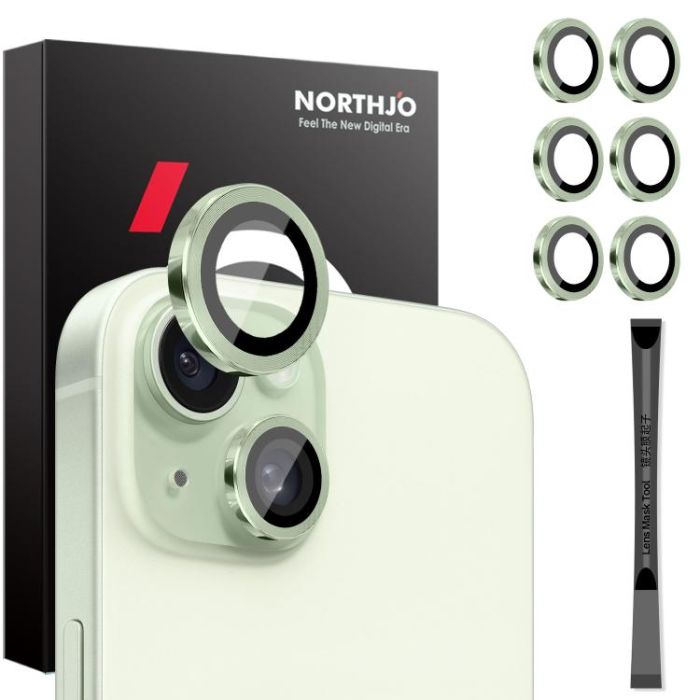 Description / For iPhone 15 / 15 Plus / 14 / 14 Plus NORTHJO 3 Set 6pcs Camera Lens Protector Cover Metal Ring Film(Green)