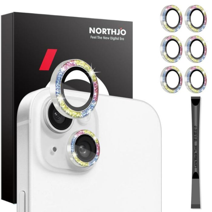 Description / For iPhone 15 / 15 Plus / 14 / 14 Plus NORTHJO 3 Set 6pcs Camera Lens Protector Glitter Metal Ring Film(Colorful)