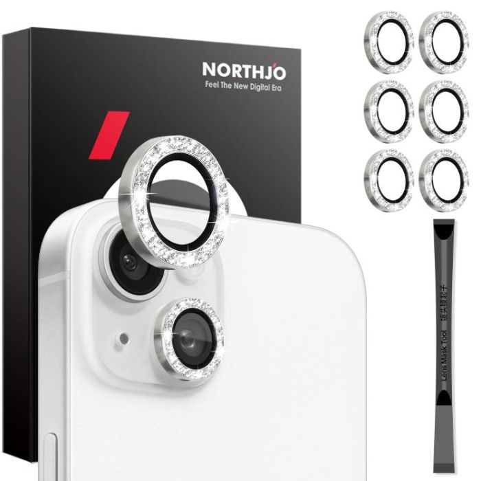 Description / For iPhone 15 / 15 Plus / 14 / 14 Plus NORTHJO 3 Set 6pcs Camera Lens Protector Glitter Metal Ring Film(Silver)