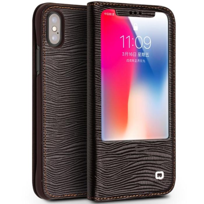 For iPhone X / XS QIALINO Lizard Texture Horizontal Flip Leather Case with Smart View Window & Sleep / Wake-up Function(Brown)
