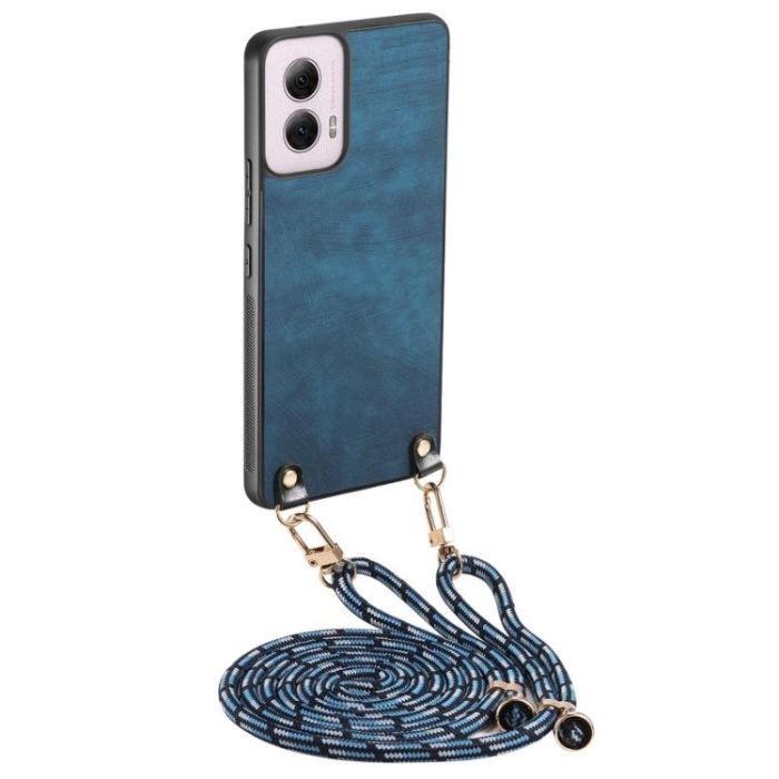 For Motorola Moto G Power 2024 5G Vintage Leather PC Back Cover Phone Case with Crossbody Strap(Blue)