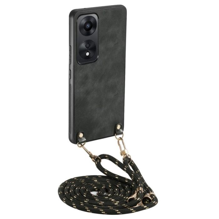 Description / For OPPO A58 5G Vintage Leather PC Back Cover Phone Case with Crossbody Strap(Black)