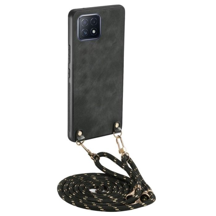 Description / For OPPO A72 5G Vintage Leather PC Back Cover Phone Case with Crossbody Strap(Black)