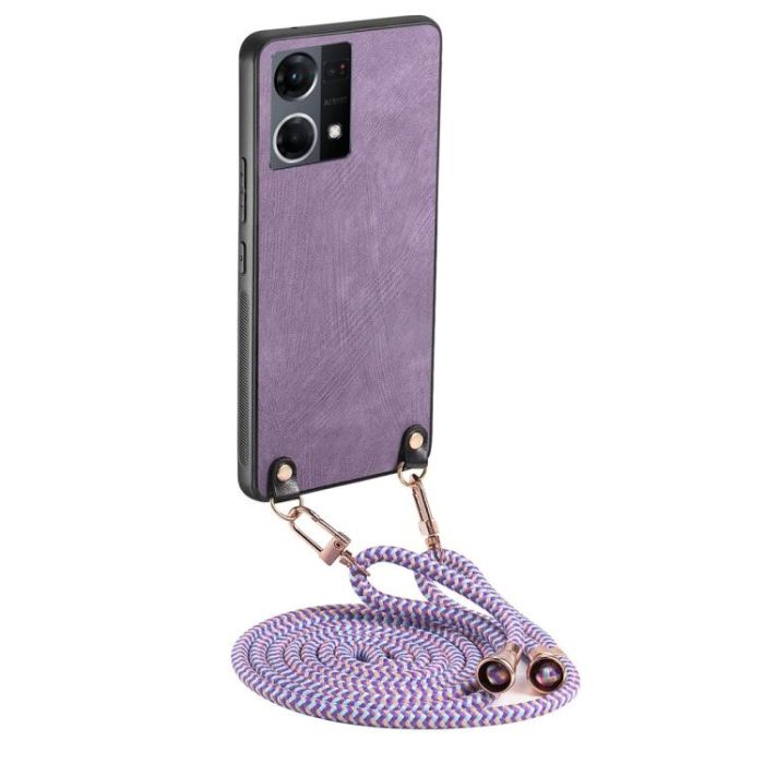 Description / For OPPO Reno7 4G Vintage Leather PC Back Cover Phone Case with Crossbody Strap(Purple)