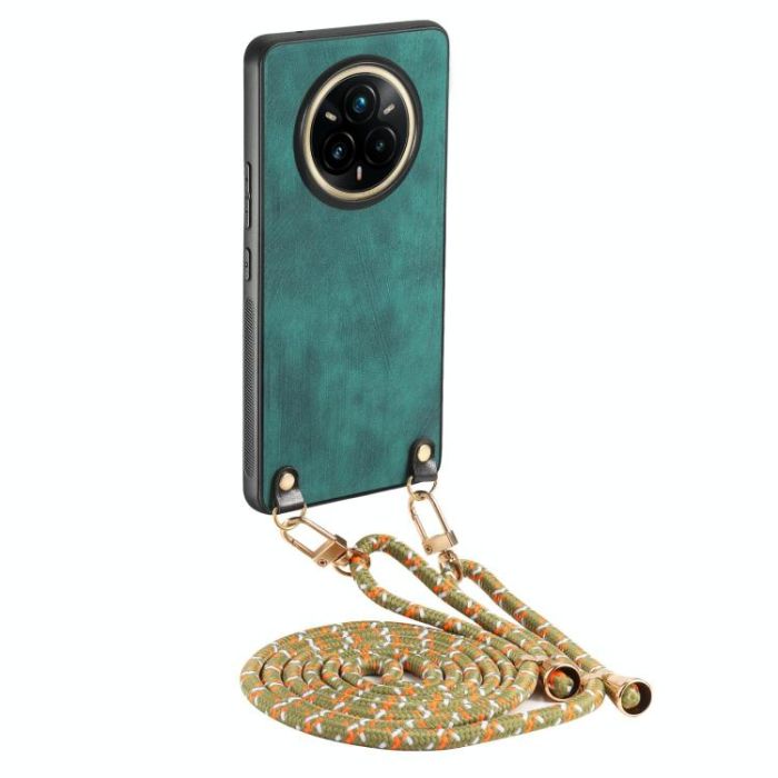 For Realme 14 Pro Vintage Leather PC Back Cover Phone Case with Crossbody Strap(Green)