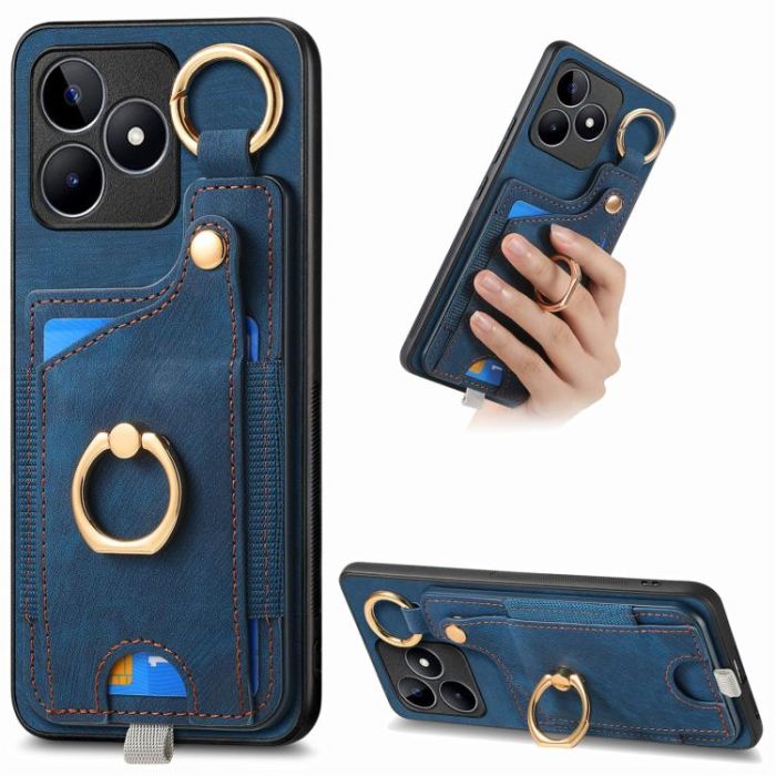 For Realme C53 Retro Skin-feel Ring Card Bag Phone Case with Hang Loop(Blue)
