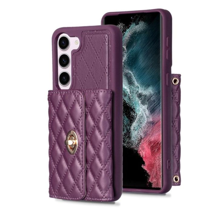 Description / For Samsung Galaxy S23 5G Horizontal Metal Buckle Wallet Rhombic Leather Phone Case(Dark Purple)