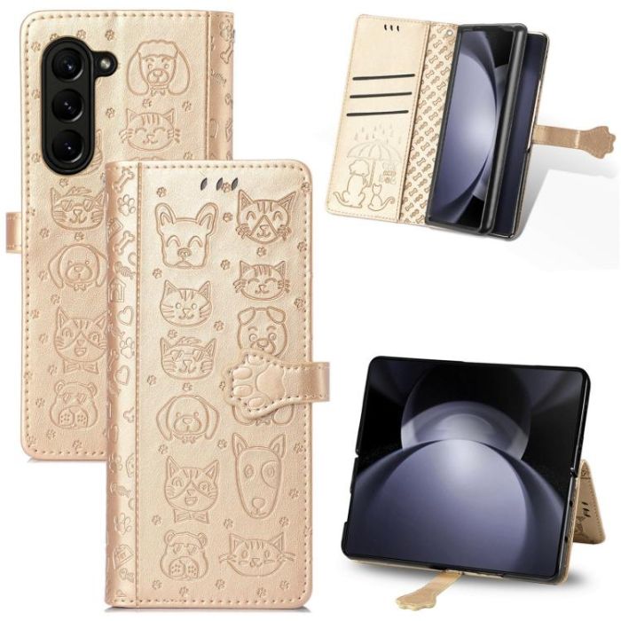 Description / For Samsung Galaxy Z Fold5 5G Cat and Dog Embossed Leather Phone Case(Gold)