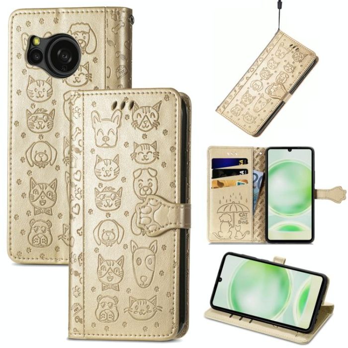 Description / For Sharp Aquos Sense8 Cat and Dog Embossed Leather Phone Case(Gold)