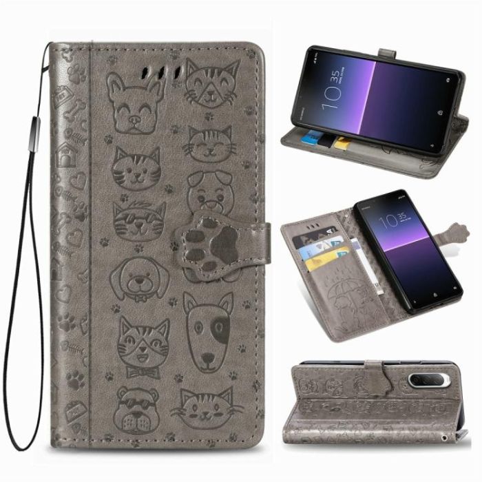 For Sony Xperia 10 II Cute Cat and Dog Embossed Horizontal Flip Leather Case with Bracket / Card Slot / Wallet / Lanyard(Gray)