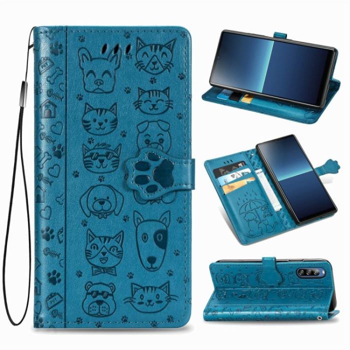 For Sony Xperia L4 Cute Cat and Dog Embossed Horizontal Flip Leather Case with Bracket / Card Slot / Wallet / Lanyard(Blue)