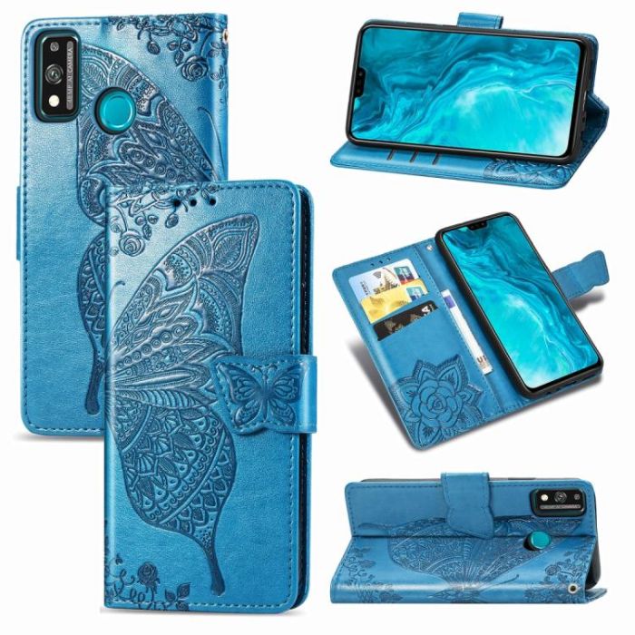 For Huawei Honor 9X Lite Butterfly Love Flower Embossed Horizontal Flip Leather Case with Bracket / Card Slot / Wallet / Lanyard(Blue)