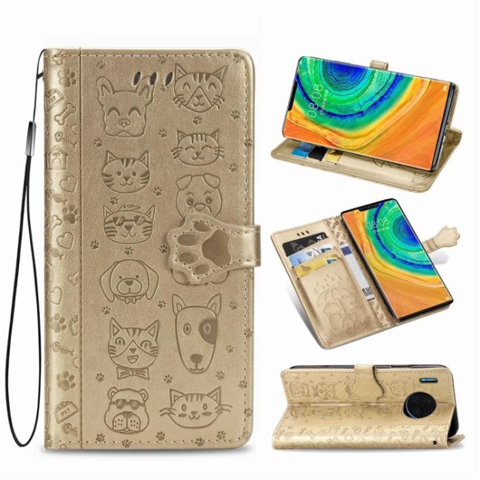 For Huawei Mate 30 Pro Cute Cat and Dog Embossed Horizontal Flip PU Leather Case with Holder / Card Slot / Wallet / Lanyard(Gold)