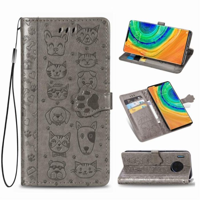 For Huawei Mate 30 Pro Cute Cat and Dog Embossed Horizontal Flip PU Leather Case with Holder / Card Slot / Wallet / Lanyard(Gray)
