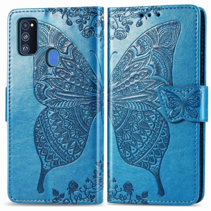 For Galaxy M30s Butterfly Love Flower Embossed Horizontal Flip Leather Case with Bracket Lanyard Card Slot Wallet(Blue)