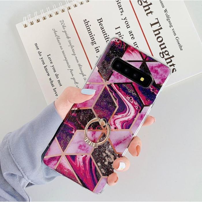 For Galaxy S10e Plating Colorful Geometric Pattern Mosaic Marble TPU Mobile Phone Case Rhinestone Stand Ring(Magenta PR5)