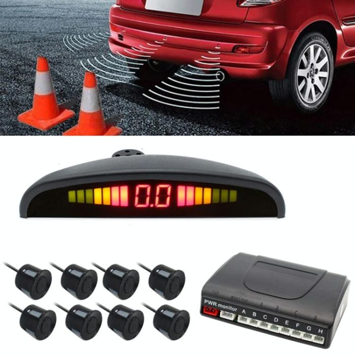 PZ-300-8 Car Parking Reversing Buzzer LED Monitor Parking Alarm Assistance System with 4*7m Front Sensors and 4*2.5m Rear Sensors