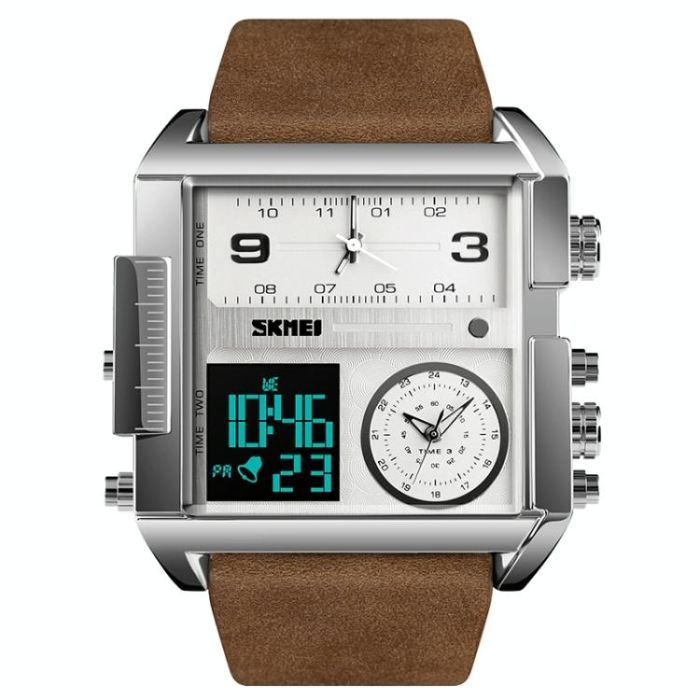 SKMEI 1391 Multifunctional Men Business Digital Watch 30m Waterproof Square Dial Wrist Watch with Leather Watchband(Silver+Coffee)