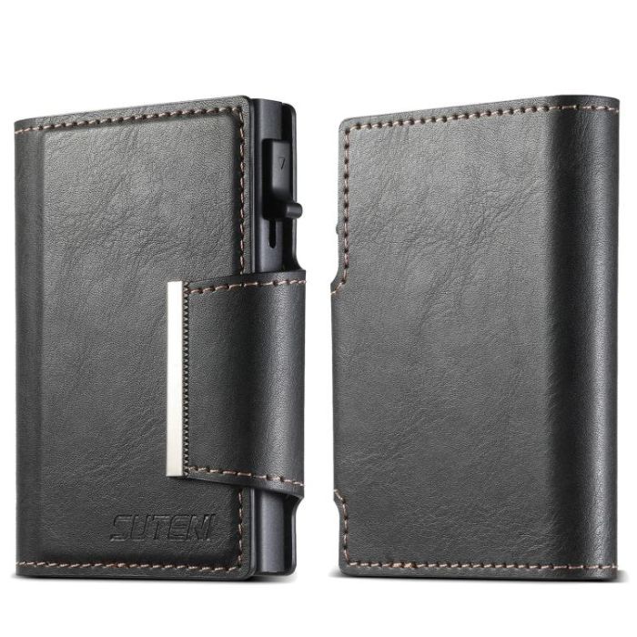 Suteni oil wax-patterned left and right buckle buttons automatically pop out the card box(Black)