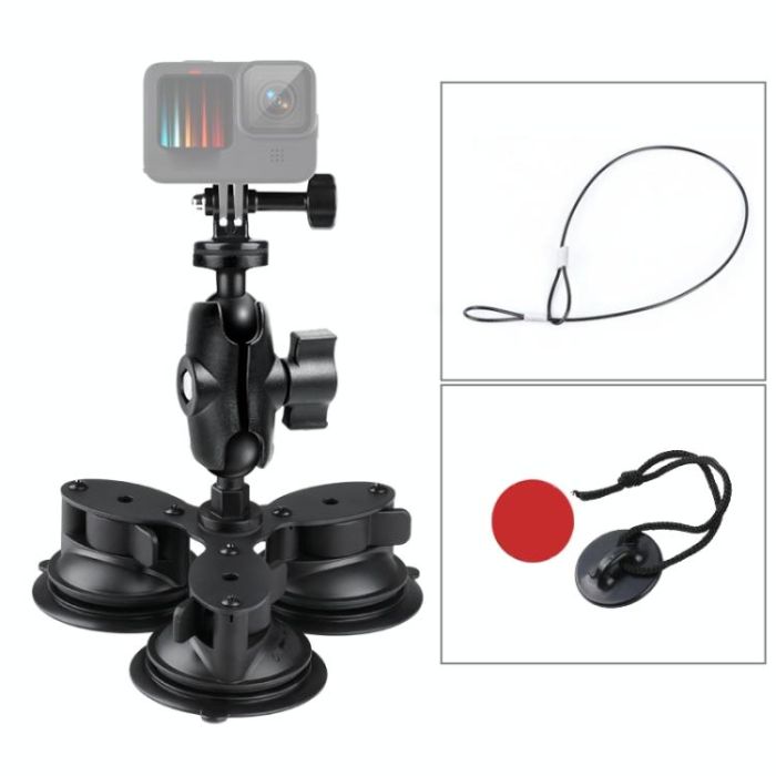 Triangle Suction Cup Mount Holder with Tripod Adapter & Steel Tether & Safety Buckle (Black)