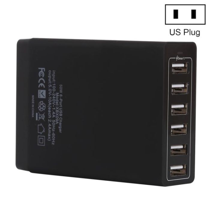 Description / XBX09A 50W 5V 2.4A 6 USB Ports Quick Charger Travel Charger(Black)